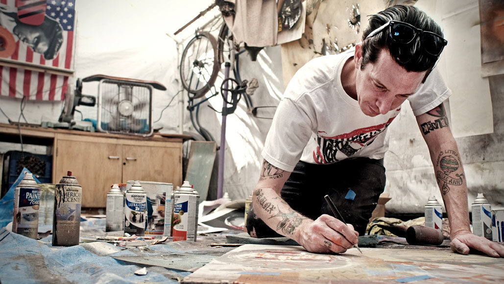 If art is a mirror to society, it’s no wonder why San Jose-based artist Jason Adams’ work is so popular. Whether it’s Marilyn Monroe wearing an eye patch that reads “Luv Me,” or a portrait of Charles Bukowski entitled “Kill Yourself Laughing,” his work speaks to the inner desires of the underdog in all of us. His stylized renditions draw from a vast arena of subjects, which share a common feel. That feel, a combination of stencil art and freeform paint strokes, takes familiar images and turns them into tones of emotion, rather than just skillfully crafted reproductions.