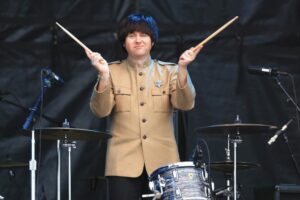 Clarke says mastering Ringo’s unmistakable drumming style was challenging. Ringo has a sweeping, side-to-side motion with his right hand. His left hand tends to be locked and straight. “The drums he used at first were also smaller and his stool was set high,” says Clarke. “Because of that, in the first, earliest shows he looks like he’s hugely tall, which he wasn’t. He’s perched way up high and gravity means he can really crash down on the cymbals and drums.”