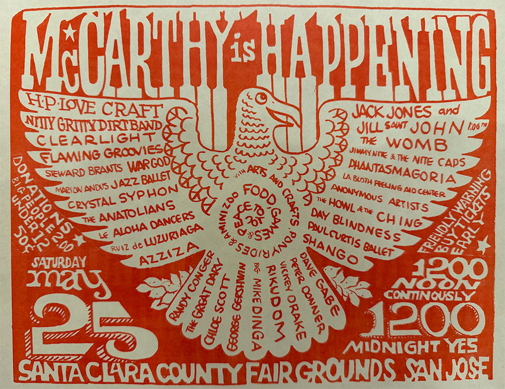 We get to see poster artwork—bold, trippy, surreal and colorful—that characterized many shows: The Doors at the Continental Ballroom in Santa Clara. Cream at the San Jose Civic. The Chocolate Watchband at the Bold Knight in Sunnyvale. All-day rock festivals at the County Fairgrounds featuring Jimi Hendrix, the Jefferson Airplane, Janis Joplin and more. Forgotten clubs like Alfie’s on Almaden Road. Steve Miller, CCR, Santana and Buffalo Springfield all played regular shows. Fritz, featuring Lindsey Buckingham and Stevie Nicks, gigged all the time.