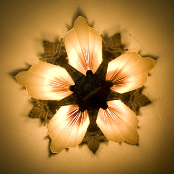 Flock's Spanish-revival house was built in 1937, "the same year the Golden Gate Bridge was built," he says. When Flock bought it in 1994, the lights had all been replaced with cheap contemporary fixtures. With an eye out for era-appropriate lighting, he came across a heavy solid bronze chandelier at an antique store near Roseland. Over the years, he searched for matching fixtures ("It took a long time," he attests), and now nearly all the rooms in his house have the same design.