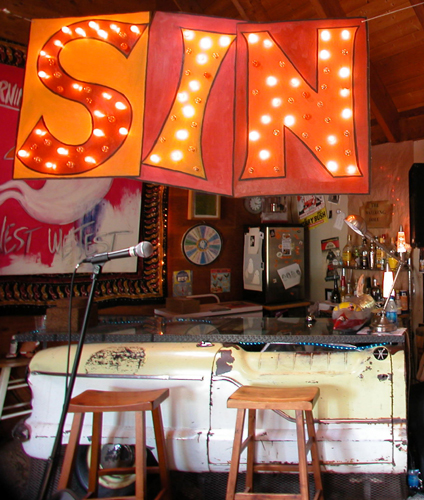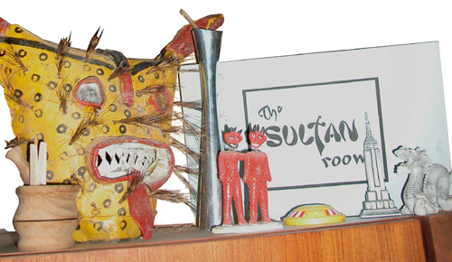 Wizzbang's father created a themed lounge, the Sultan Room, at the St. Francis Hotel in Hollywood in the early 1950s. This sign, which has surely witnessed its share of exciting Hollywood action, was passed on and now sits above Wizzbang and El Fudo's kitchen, protected by monsters, dragons and sparkling demons.