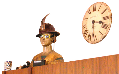 The kitchen overhang holds mini-altars of such family items as little mask-wearing monsters, plastic dinosaurs and a bust that Wizzbang's art professor father used in the classroom. Constructed of bakelite, an early plastic material, she's since been clothed with gold paint and a 1930s park ranger hat.