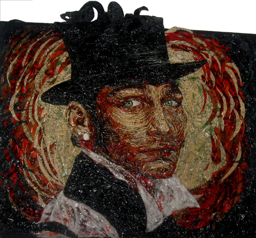 Wizzbang's eerily detailed paper collage paintings line the halls of the house's front entry and hang over the couple's homemade bedroom altar.