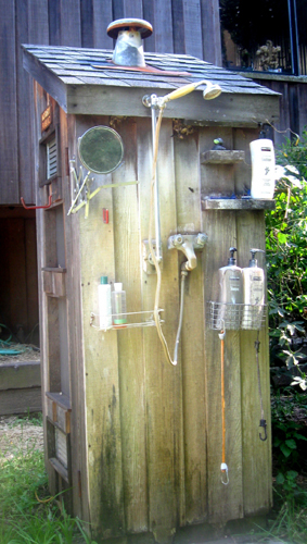 Even grown men enjoy an occasional outdoor shower. This fully stocked sun shower provides many a summer refresher behind the house.