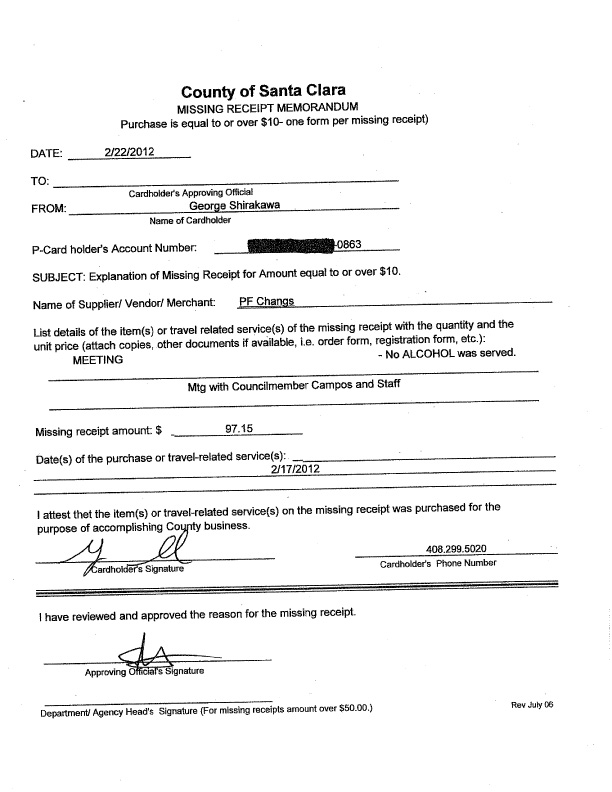 Metro has now found that Shirakawa also violated expense limits and policies against taxpayer-funded alcohol consumption by exploiting a loophole that allowed officials to submit a “Missing Receipt Memorandum” in cases when the original, itemized receipt was misplaced. From January 2009 through September 2012, Shirakawa expensed 185 meals to the county and yet only three were accompanied with itemized receipts, according to county forms.
