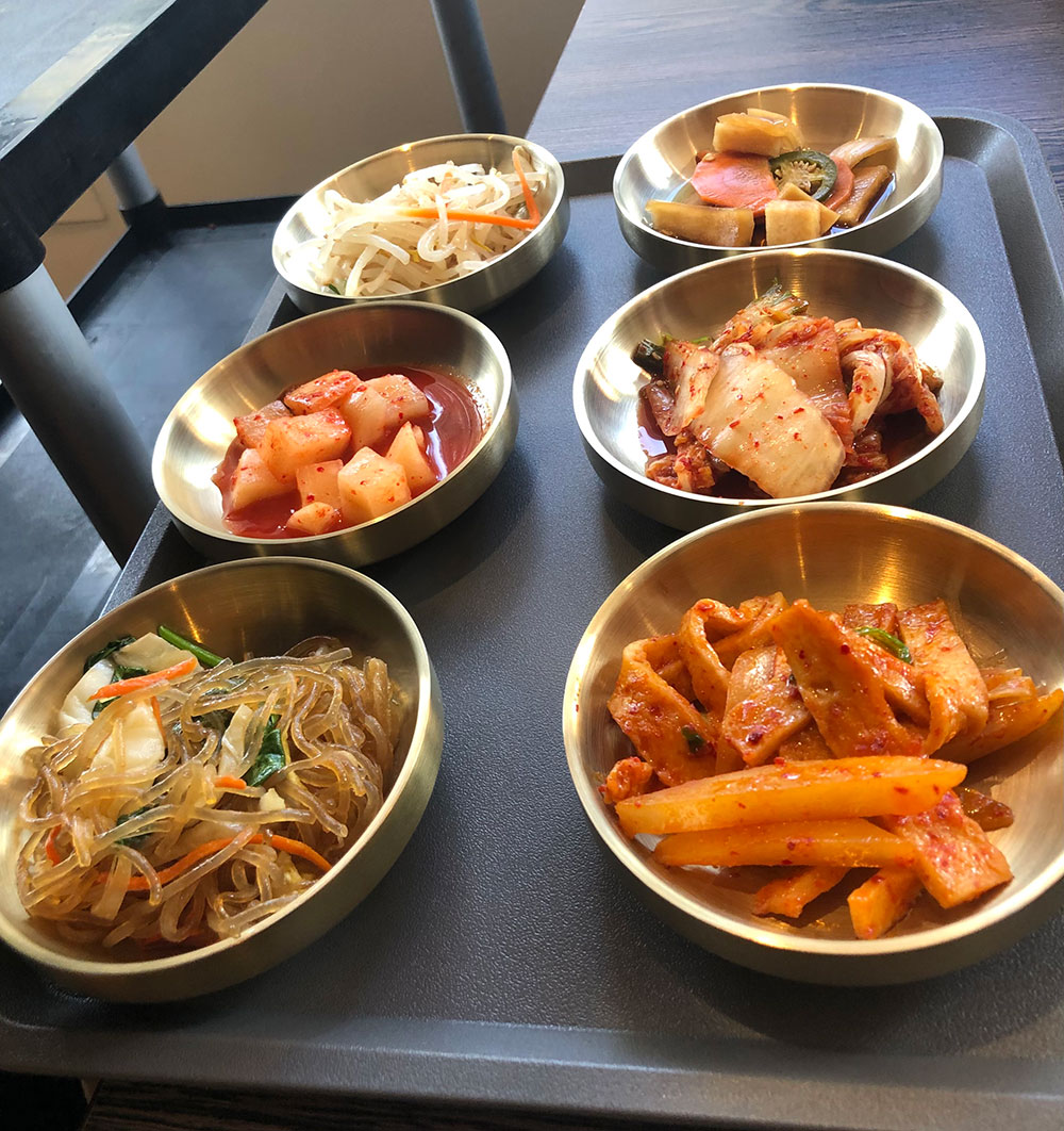 Accompanying any entrée dish is a set of little sides, called banchan, including spicy fish cake, pickled daikon radish, kimchee Napa cabbage, marinated bean sprouts and pickled jalapeños and carrots.