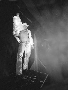 Roving spotlights prowl across a stormy sea of dancing bodies moving to the grinding beat of a booming sound system. Two muscular, scantily clad male dancers wiggle their bronze bodies atop two high platforms in front of a giant prop rocket. On a huge projection screen hanging from the ceiling, animated figures wander through computer-generated alien landscapes.