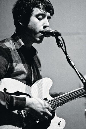 USING THEIR POWERS FOR GOOD: Solo acoustic performances from local musicians like Evan Jewett of Worker Bee and Famiy Room have turned Good Karma’s Thursday music nights into a unique showcase. Photograph by Leslie Hampton