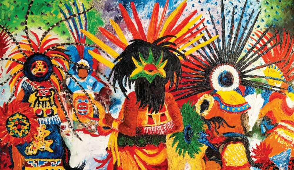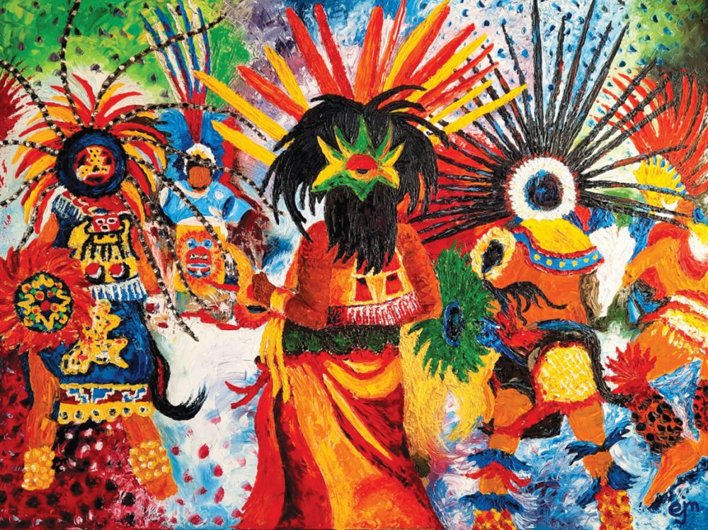 Speaking via video call, I get a glimpse into her art studio, spotting a canvas depicting an Indigenous dancer painted in vibrant colors. Montelongo earned a BFA in Pictorial Art from San José State University and serves as a Board Member of Poetry Center San José and manages Roots Artist Registry, which publishes La Raíz.