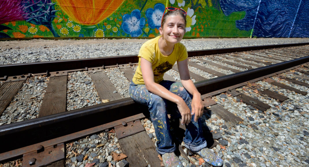The 9,450-square-foot mural by local artist Lacey Bryant depicts rolling hills of native California wildflowers. The vibrant art adds color to the otherwise brown segment of railroad tracks.