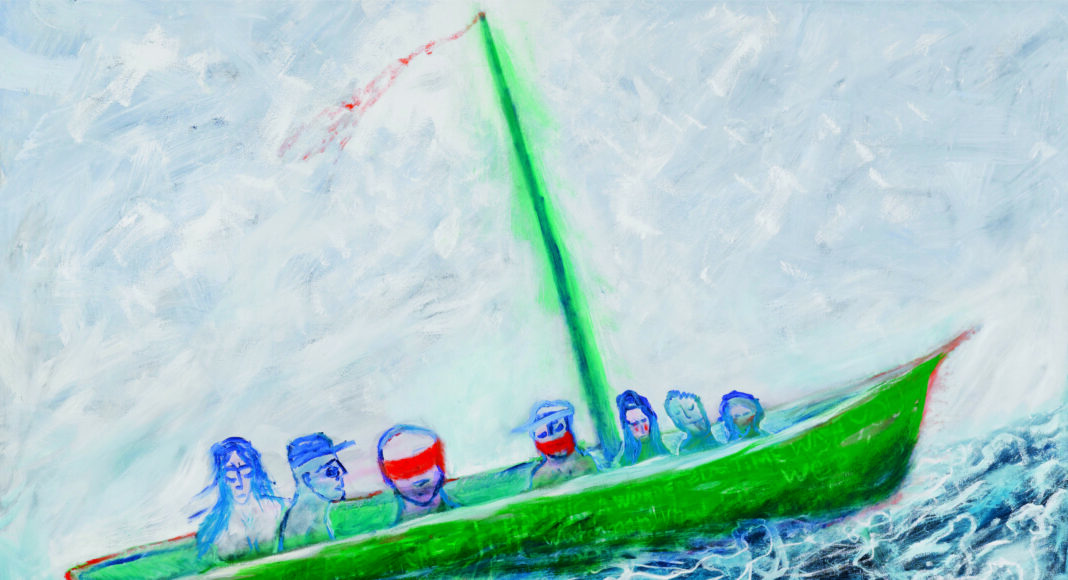In the new collection’s 50 paintings and other pieces, Ferlinghetti translates all of his life experiences—personal, social-political, artistic inspirations, etc.—through the use of frequent themes: people in boats, the sea, birds.