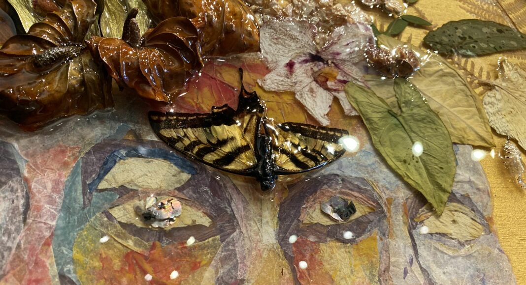 Wallace-Gonzales’s more two-dimensional works reveal themselves slowly, a quiet cacophony of faces turning towards one another. Her resin pieces erupt and take flight as moths and butterflies appear to leap and fly off the work.