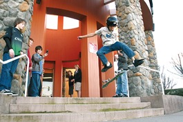 BOARD YOUTH: Mickey Maher kick-flips down the flight of three stairs at Hollywood Video in Los Gatos while friends watch.
