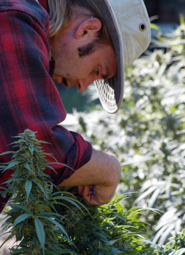 THE CHRONIC GARDENER: A WAMM volunteer trims leaves from a marijuana plant at what could be one of the last harvests on the Corrals' property.