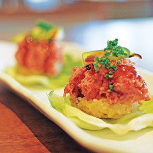 For a more modern twist under the Now menu, we opted for crispy rice with spicy tuna ($10 each). Small rice cakes arrived on a butter lettuce cups with scoops of minced and seasoned tuna on top. The dish was unremarkable, which made the small portion easier to accept. The salmon skin hand roll ($9) also tasted similar to what can be found at any other sushi restaurant, and was awkwardly closed with a loose strip of nori at the bottom. However, the soft shell crab cut roll ($18) was artfully presented in a stacked pyramid, offering a unique take on the classic by wrapping shaved daikon around the outside of the nori. Everything about this rollfrom the sushi rice to fried soft shell crabwas delightful.