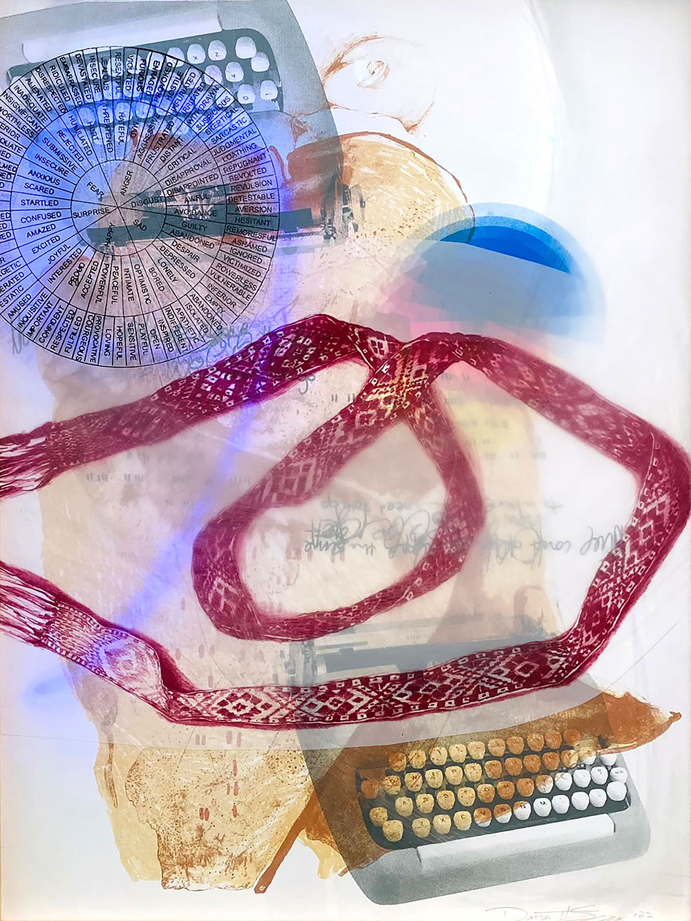 Dana Harris Seeger, for example, explores her Estonian and Latvian roots in her collage, “Sleeping Twins,” the name a nod to the fact that she’s both an identical twin and a mother of twins. Seeger mixes photographs and paintings of bright colors, typewriters and a red, woven belt native to the Baltic region. It’s displayed on a light box with motion sensors.