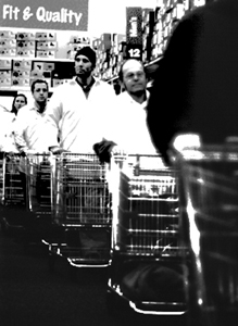 Gillis is waiting here for other members of Whirl-Mart Ritual Resistance (www.breathingplanet.net/ whirl/), a loosely organized band of social activists who don white lab coats en masse and silently push empty shopping carts through Wal-Mart--a combination of activism and performance art. According to their website, "As a form of active resistance, [Whirl-Mart] is peculiar in that it functions quite differently than an ordinary protest. First of all, it is a silent activity. There is no direct solicitation of propaganda and no intentional confrontation with the target audience. Rather, Whirl-Mart utilizes tactics of occupation and reclamation of private consumer-dominated space for the purpose of creating a symbolic spectacle."