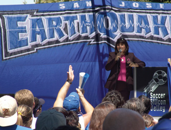 Rally Round the Jersey: Santa Clara Mayor Pat Mahan spoke on behalf of the Quakes at the August rally; San Jose Mayor Ron Gonzales was nowhere to be found.