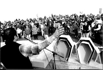 Anti-invasion protests over the Martin Luther King Jr. holiday weekend drew hundreds of thousands of protesters to sites around the world, including San Francisco and downtown San Jose. In a protest organized by Richard Ajluni, protesters marched from Saint James Park to Plaza de Cesar Chavez, where a speaker podium was surrounded by tombstones bearing the faces of Iraqi children.