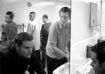 Keyboardist Ray Ray Bautista bumps an *NSYNC CD and extols the virtues of its production values. Guitarist Gabe Ausiello claims to own five Celine Dion albums and plans to buy Billy Ocean's Greatest Hits next. Bassist Paul Kriz dresses like a science whiz but says he moonlights at McDonald's.