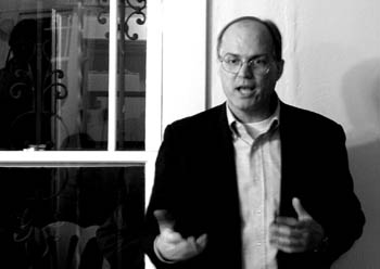 The South Bay, as always, demonstrated its progressive bent for Cobb's campaign swing. In Milpitas, Cobb was joined by a grand total of six enthusiastic listeners, one of whom was his host, Warner Bloomberg, who is running for the Assembly District 23 Green nomination. The number in the audience had a chance to swell to seven when a resident wandered past Cobb's group, but she quickly went on her way when she discovered the gathering was political. Later, in a room provided by Casa Vicky, Cobb pulled off a rousing stump speech for the benefit of an audience numbering in the low teens. Again, Bloomberg was part of the mix.