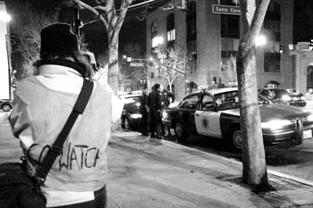 The man behind the camera is Jacob Crawford from Berkeley Copwatch, here to kick-start the San Jose Copwatch that began to roam the city streets in early January. His goal? "To police the police." On this Friday night in February, he and a small posse seek out officers on duty to observe with their eyes, ears and video recorders. Much of their time is spent chasing calls on the police scanner and circling the busiest downtown areas on weekend nights. Through a combination of persistence and luck, they occasionally find themselves in the right place at the right time.