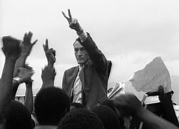 Carter's focus on human rights energized Dominique; we see footage of the Haiti Inter report on the assassination of Nicaragua's dictator, Somoza, where the reporter editorializes, ever so slightly: "They say Somoza's body had to be scraped off the ground"--a message in code to the Duvalier-blighted audience in Haiti that said, "Sic semper tyrannis."