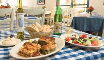 Offbeat Offerings: Left to right: taramosaláta; a plate of pastitsio, dolmades and spanakópita; horiátikisaláta.