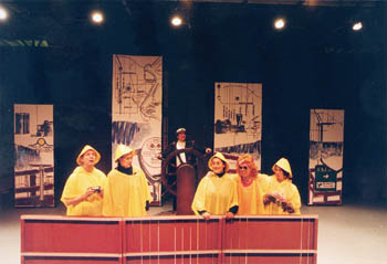 That Lindsay-Abaire is deliberately playing with the mercurial, unreliable nature of human logic becomes obvious in the scene where the six main characters are paired off in three different theme restaurants. Cass and her new lover, Captain Mike (Jeremy Lee Anderson), take in a meal at a Medieval Manor. Lois and Kip's hired gumshoe, Karla (imposing and memorable Jackie O'Keefe), are dining Native American-style. Kip is eating out with Karla's husband, Glen (Jim Johnson), at a Gothic restaurant. As the spot highlights each table (and the painted scenic panels behind them), and the corresponding theme music comes up, versatile quick-change artist Valerie Allen appears as the saucy wench, the disgruntled Pocahontas or the shrieking Mortitia to wait on the tables. This tight, well-timed scene, the culmination of the play's wit and City Lights' production skills, unfolds like a series of comic-book frames. And the dialogue bounces from one contradictory story to another, in a cacophony rivaling the confusion inside the human mind.