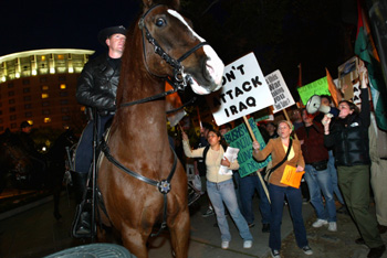 On Wednesday, March 19, the night the war began, a half-dozen wailing women in pink, wearing gruesome war-victim makeup and mock bandages, led a crowd of 200 protesters to the Kalorama home of Defense Secretary Donald Rumsfeld about a mile away. They managed to stop rush-hour traffic en route, engaged in a brief skirmish with police in which a young man was arrested and presented a child-sized coffin made of Styrofoam to a two-story brick house.