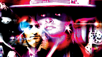 Figures emerge from abstractions. In Century 21, we can see a cowboy-hatted woman with cat's-yellow eyes—Raquel Welch in the cheesecake Western Hannie Caulder (she is Blake's Sarah Winchester surrogate). Drilled through the eyes, a gunslinger sits as an airbrushed rainbow snake emerging from the bullet hole. Appropriated drawings materialize and fade: an off-register print of Peter Pan's Lost Boys amid neon bars and flurries of white light; an image from a Charles Addams cartoon of a group of 1950s children playing cowboy and chasing a little green man with their guns back into his space ship. In its cowboys vs. flying saucers imagery, the cartoon seems to link the extraterrestrial Century Domes and the House That Rifles Built.