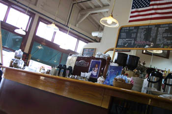 Here at our lovable cafe/trattoria, Mediterranean vibes fill in the culinary gaps. Tessa looks into the main room, admiring the huge array of local oil paintings lining the walls around the central espresso bar. Plates are removed, and more plates arrive, this time filled to overflowing with pastas. Tessa's is tossed with crimson, tomatoey goodness--nothing to give Marcella Hazan a bad night's sleep, but workmanlike, tasty pasta. Baby bay shrimp lazily lace the reddish sea of pasta--pasta that is four clicks past al dente, and then some. My linguine, also way past al dente, comes tangled in a froth of eggs and prosciutto. Italian ham and eggs in pasta: it is comforting, if overly plush.