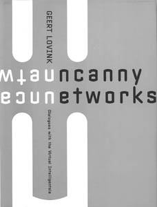 Joel Slayton, director of the CADRE Laboratory for New Media at San Jose State University, wrote the forward for Uncanny Networks. "Silicon Valley doesn't sit in the world autonomously by itself," he warns. "The Internet has created a distributed consciousness throughout the world, resulting in people working and thinking about technology in many different ways. And we often aren't conscious of the fact that there are other ways of looking at the issues surrounding networked culture and the emergence of new media. Geert Lovink has been traveling the world, interviewing new media artists and artists working with networked technology and getting their viewpoints. It's important to hear what he has to say."