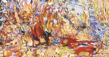 Bay Area artist Kremer has a degree in art history, and her influencesMonet's Waterlilies in the grass-blade strokes of First Sighting (1993) and Jackson Pollock in the fleshy reds and pinks of The Myth of Creation (2004)are clearly displayed but never pedantic. Her uninhibited touch, using a wide variety of brush sizes, strokes, daubs and scrapings, conjures up dancing images in full flux, like witnessing some wildly colored electromagnetic phenomenon at the subatomic level.
