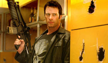 A creampuff named Thomas Jane plays Frank Castle, undercover cop ready to retire; he's at the retirement party when his whole family is wiped out by black-clad assassins. One of the demised is former '70s leading man Roy Scheider, whose frightful twinkling eye signals that he wants more out of the part than to just be a dead dad. Some hinted-at Caribbean voodoo raises Castle from the dead, leaving him with a sad little scar the size of a cigarette burn where he got shot in the chest.