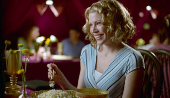 On some level, this works, with Austen's England of the Regency mimicking another conservative society. The novel takes care of itself no matter how it's filmed. This Pride and Prejudice, shot in Provo and Salt Lake City, with a finale at a wedding chapel in Las Vegas, shows modestly cool surfaces: brightly colored clothes, rock music, ski trips, walks through the city at night. There are even orgies of Coca-Cola, loaded with church-forbidden caffeine. The overstressed joke about the women porking out on ice cream during their periods shows a man's hand, though. Another updating--insurance against a too-white movie?--is that Jane (Lucila Solá) is portrayed as an Argentinian. Solá plays the character as if she were Charro's daughter; childlike, energetic, on fire with Latin sensuality and so forth.
