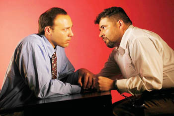 Solís has orchestrated the stage space like a filmic soundtrack, making the telling harder and faster without coming off as "artsy." He gives us the theatrical version of split-screen action: counterposed monologues (the simultaneous summations of two lawyers), storytelling in the round (several characters recounting their part in the judge's murder), contrapuntal multilogue from several set zones at once. Kudos to fight choreographer Carla Pantoja and the actors' razor-sharp timing for scenes of hold-your-breath actionshout fests, knife play, gun waving, rope bondage. In one scene, slight Lucinda Serrano (as Vicky) unleashes on the taller Tom�s, and in this flash-rage moment, he seems both defenseless and untouchable. For all the visceral action, Solís has a devilish sense of humor and splatters it unabashedly throughout. Willis the hit man breaks into eerily realistic birdcalls (Gough has a knack). When Mike's pregnant wife Nena (Marilet Martinez nails this scrapper) suggests a romantic dip in the hot tub, Fernie says, "No Jacuzzi; I don't want her barfing in there." Judge Benton (Kurt Gravenhorst) pours out his Jekyll/Hyde politics in a humorous (and alliterative) acting gem. This show's highlights alone could fill several reviews. Suffice it to say, Santos & Santos should have people camping out overnight at the box office to get tickets.