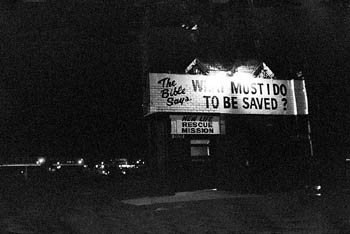 The best film is Late by Diane Cheklich of Royal Oak, Mich. She shows an urban desert by darkest night, lit by flashing, incomprehensible neon signs and cryptic billboard messages ("Time Flies When You're Having Pork"). On the soundtrack is a snatch of stolen radio broadcast from a Detroit area, late-night phone-in faith healer, a woman who promises aid from "witchcraft, the occult, divination and jinxes." (Her method seems to involve the application of sacred olive oil.) Cheklich's lens depicts the world as a ghetto at midnight, where even solicitations to go to church and repent are in screaming letters of electric light: "If you are in pain come right in."