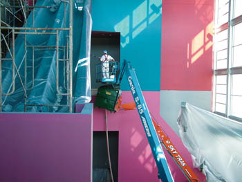 TWO WEEKS BEFORE its opening, the former United Artists Pavilion in downtown San Joseabout to be renamed the Camera 12is still heavily under reconstruction, with plywood on the carpet and a maze of stacked cardboard boxes on the main floor. Dumpsters and about a dozen mobile platformsused for hoisting workers to the ceilingare parked in the lobby. There's a smell of sparks in the musty air from the carbide handsaws slicing through metal studs as workers make pony walls in the bottom-floor auditoriums. Some of the auditoriums are still stripped down to tar paper, waiting for the drywall to be installed.