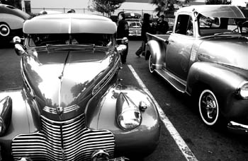 It's obvious that most of the people rode here in styledozens of classic cars are lined in rows that attract admiring browsers. A 1949 Aero Sedan catches my eye, a clunky, rounded car complete with a dinner tray for a hamburger and fries, as well as a portable pole with real drive-in movie speakers.