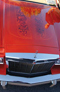 Jose Aldaz from the San Jose Inspirations Club shows me his "One Pinche Grand Prix," the name he gave to his 1983 Pontiac (pinche is the Spanish equivalent of fuck). He's won many awards for the intricate paint job, a delicious berry color with light rainbow stripes contrasted against a pure white interior.