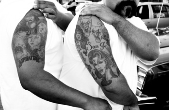 With his pale freckled skin and sandy blond hair shaved close his head, Gilbert Lara stands out from many of the other lowriders. But this heavyset man wearing a leather vest proudly baring his tattoo-covered arms seems perfectly comfortable at the predominantly Mexican-American barbecue.