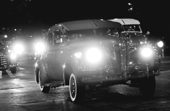 He pulls a few more tricks to show off, boosting the rear end and arousing excited hoots and scattered applause from passersby. The six other driversall with Chevy Impalaspull alongside us in a street scene that could have come out of the '60s.