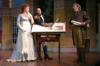 And in the first scene, Lady Croom (a strutting Amanda Moody) engages landscaper Richard Noakes (John Mercer) in a lively discussion about his picturesque notions. Noakes' wild and Gothic "natural wilderness" is Lady Croom's "eruption of gloomy forests." And his proposal for a faddish hermit dwelling meets with Lady Croom's "What's this rustic hovel that presumes to superpose itself on my gazebo?"