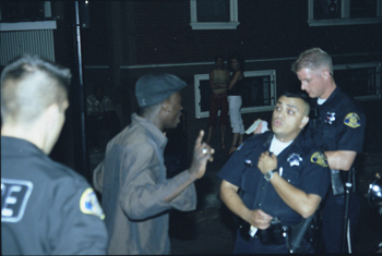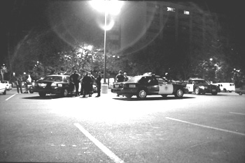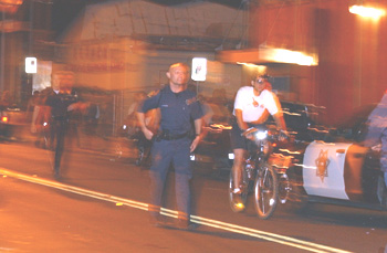 First Street, San Salvador Street, Second Street and Third Street are all closed off in such a way as to divert all traffic south on Second Street. Four squad cars are lined up on the north end of the block, seven or eight on the south end--all the police cars are purposely parked in the field of vision of the exiting patrons; in fact, if the nightclubbers loiter too much, the officers simply train their bright headlights on the customers (on this night, the headlights were already on when Carabarin got there, prompting him to instruct that they be turned off unless things got troublesome). The police officers are congregated in the intersection watching the night life evaporate.