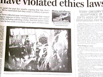 Rather, the story was placed at the back of the Valley section, on page B6, in the paper's opinion section, which is the area of interest for many of the area's policymakers. On one level, this makes sense. The hit piece was one of 38 editorials the Mercury News has run since the beginning of the year as part of a series on "money and influence" at San Jose City Hall.