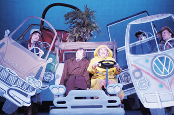 AFTER EARLY apprehension over how to translate the 1971 film Harold and Maude to the stage with its frequent, nimble scene changes, TheatreWorks' West Coast premiere of Harold & Maude: An Intimate Musical (with book and lyrics by Tom Jones of Fantasticks fame) proves that memorable scenes are memorable scenes, no matter how you get in and out of them. Moreover, the production works hard to have lively visuals and frequent scene changes on the Lucie Stern Stage (scenic designer Thomas F. Langguth), with three tiers of scrim panels moving in and out and stage business just short of magic. People holding cardboard cars in front of them (as in a first-grade pageant) help create the highway on which Maude (Pamela Myers), the driving dervish, terrorizes her protégé in life lessons, Harold (Eric Shelley).