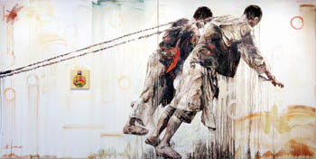 The aggressively horizontal Pullman (2004) displays two straining men against an abstract background leaning hard to the right as they tug on two rough ropes attached to an invisible burden outside the frame at the left. The paint dribbles in streaky rivulets from their heads like sweat. Incongruously, behind them, is a small wooden panel mounted on the canvas with a delicate, colorful rendition of a porcelain vase.