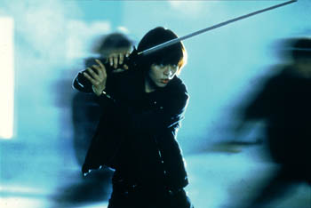 The violence--by the terms of cinema in 2003, anyhow--is so far over the top that our concept of top is bottom to it. Yuki gets her hand pinned--very slowly and knife-twistingly--by a sword while an evil lesbian named Soma sits over her chest and vilely licks a droplet of blood from Yuki's Barbara Feldonish lower lip. Our heroine doesn't take this lying down, naturally, but the timing goes beyond an ordinary satisfying "yeeccch" to a more disquieting "eeeeeeeeeeuuuuww, jezus."