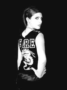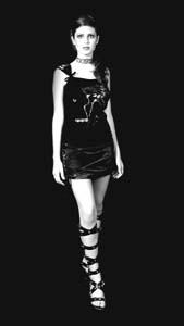 Whether in the gladiator ring or on the dance floor, Vanessa makes an impression coming and going, in De Cre's black T-shirt with dragon logo and cargo drawstring mini in black satin.